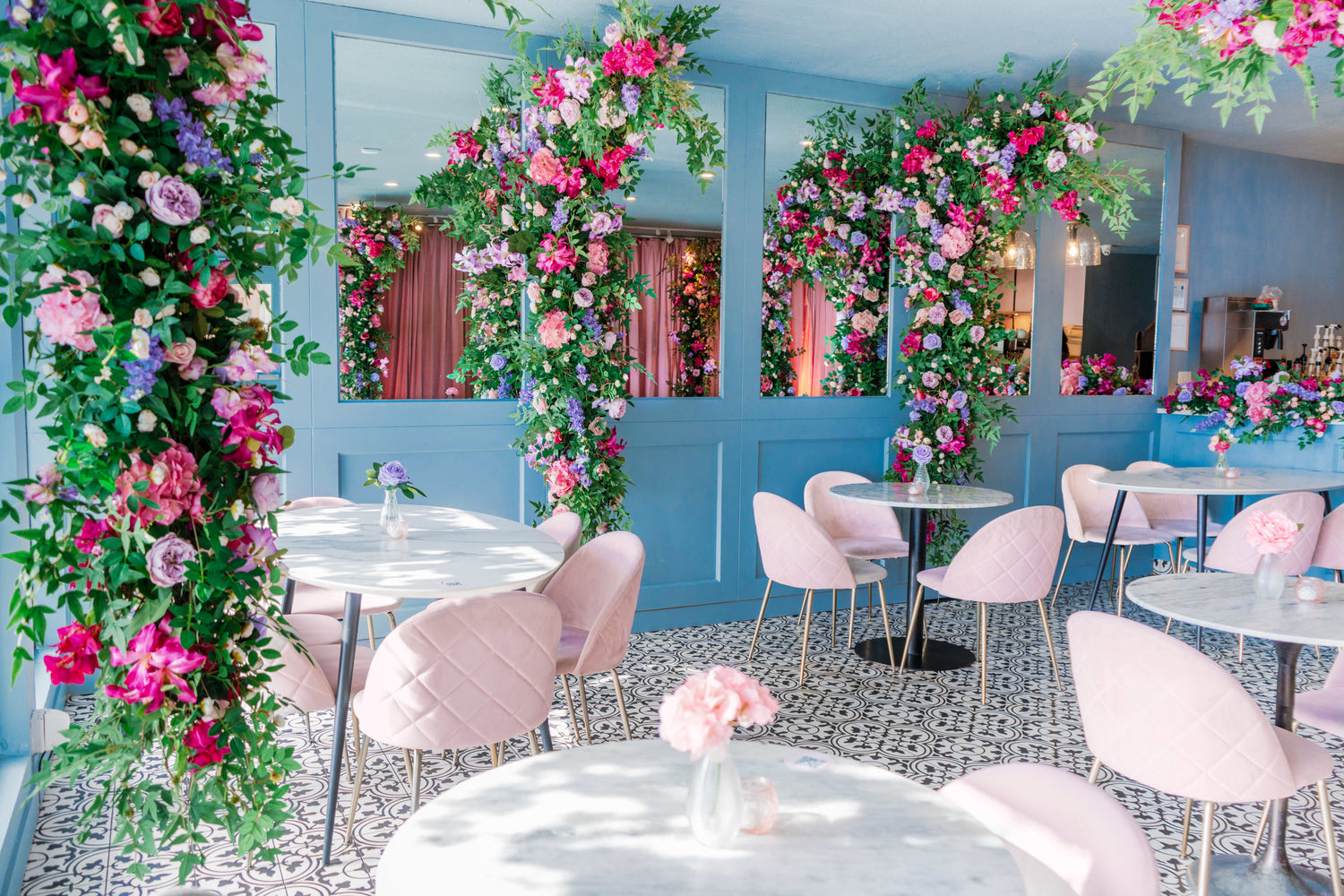 Enjoy the warm weather on our pink floral benches underneath our floral garland. Our patio is weather-dependent and seated on a walk-in basis (no reservations). Available in the summer only (late May-mid September)!