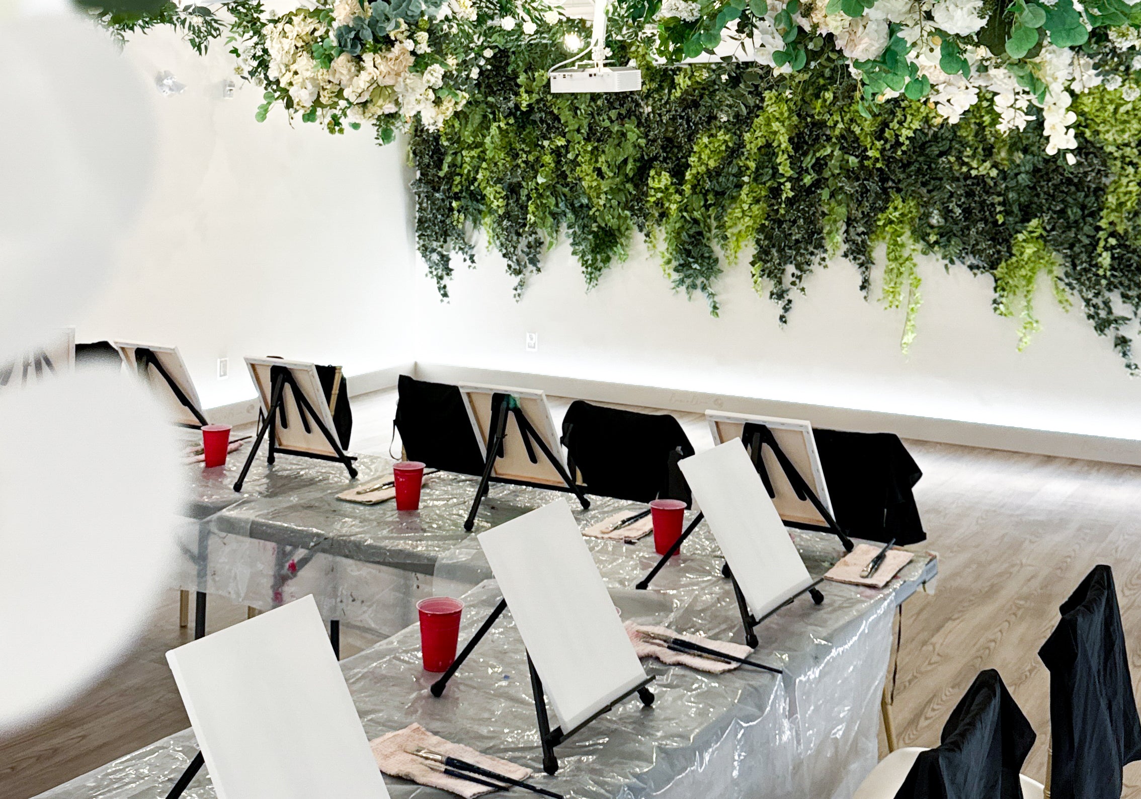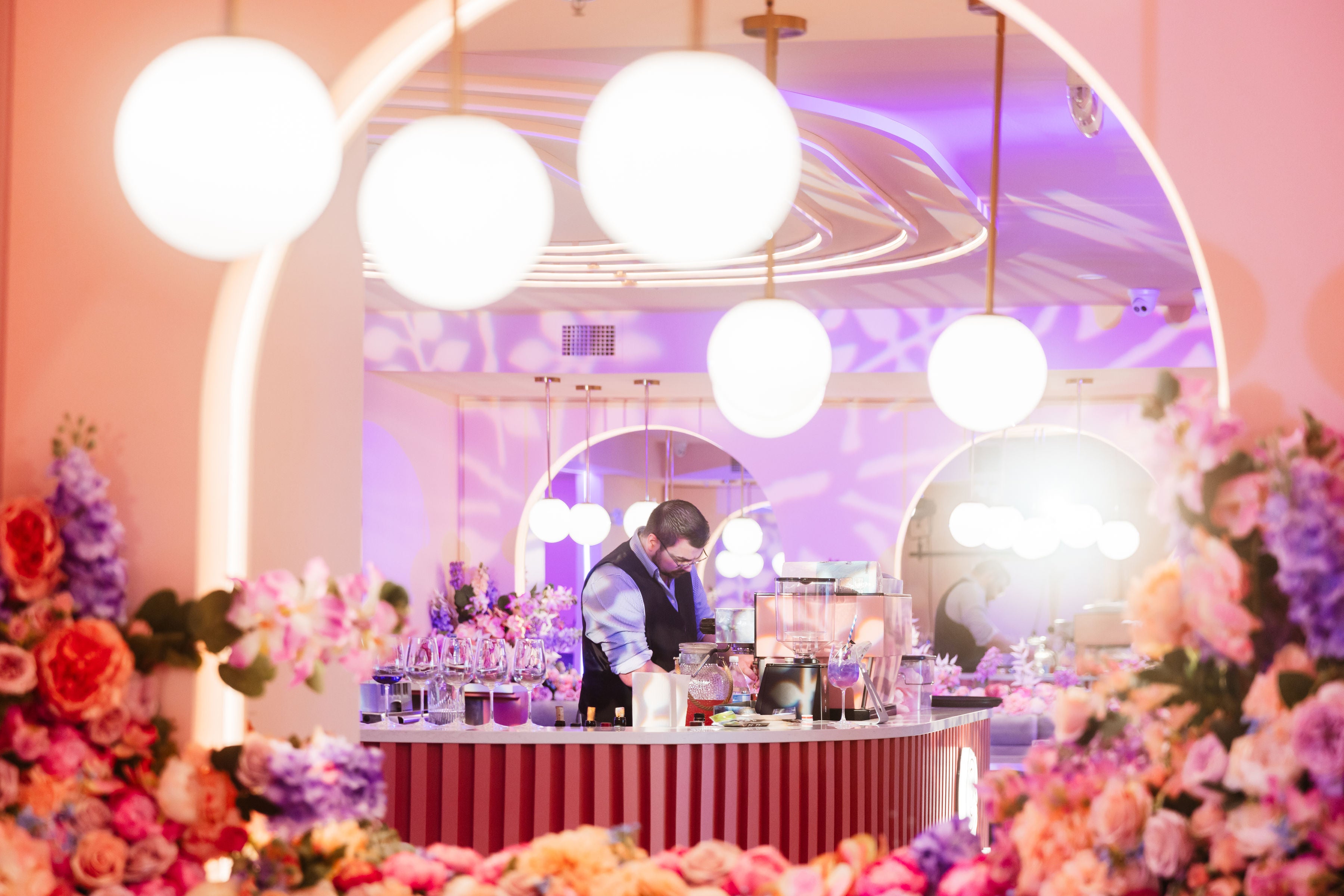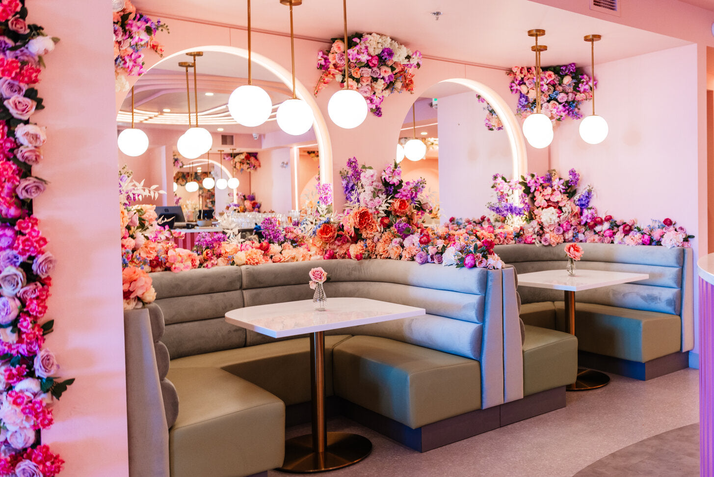 Welcome to the Golden Blossom Room, a radiant haven adorned with lush yellow, pink and white flowers. This enchanting space features elegant arches filled in stunning blossoms and glowing lights, creating a magical atmosphere. By day, the room transforms with warm hues perfect for a cozy brunch, while in the evening, it shifts to a serene ambiance, making it an ideal spot for a romantic dinner or a night out. Don't forget to look up when sitting in the Golden Blossom Room to see our light-up Brew+Bloom logo!